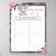 Floral Girl Elephant baby shower games activity - Guess Baby Animal Baby Shower Game card with watercolor pink flowers background and customisable text, A-Z animals baby game.