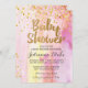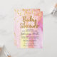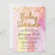 So trendy, this invitation features a pink watercolor background and faux gold lettering and confetti falling in the background.