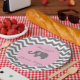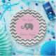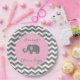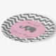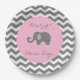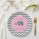 These modern grey and white chevron print baby shower plates have a pink centre and an elephant. They say "It's a girl!" and have room for the new baby's name on the bottom.