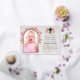 On the right side, there is text. Above the text, there is a gold foil cross, surrounded by pink and white orchids. The occasion "Baptism and first birthday" and the name are written with gold foil, the rest in small black caps. The background is white marble.