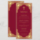The menu has a vintage faux gold frame. Above the text, there is a faux gold cross. The title "Menu" and the subtitles are written in caps. All text can be personalised and has a golden colour similar to the frame. The background is burgundy. On the back, there is the same vintage frame.