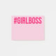 Hot pink #GIRLBOSS graphic and light pink post it notes.