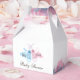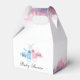 Cute favour gift boxes for your girl and boy twins baby shower written in fun grey baby shower typography and a stylish script with pink and blue watercolors of two shoes. Personalise the names and shower date in simple typography.