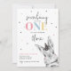 Bunny birthday invitation with a cute black and white bunny featuring a party hat and colourful dots.
