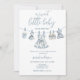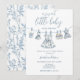 Blue Chinoiserie Toile girl baby clothes Baby Shower Invitation. This baby shower invitation features baby clothes on Chinoiserie Toile theme, teddy Bear, and a Chinoiserie toile de jouy background. this is the perfect invitation for your trendy and elegant baby shower.