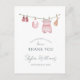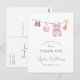 Our gorgeous thank you postcard features a delightful watercolor illustration of tiny baby girl clothes hanging on a clothesline. Each piece is lovingly painted with soft pastel colours, creating a heartwarming and elegant design that perfectly sets the tone for celebrating the arrival of a precious little girl. The design is minimalist and modern with elegant typography.