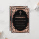 This elegant rose gold pink and black confirmation invitation with a vintage air, recommended for a girl, has an ornate (faux) rose gold foil frame with elegant baroque decorations on a black background. Above the text there is a religious cross in rose gold. Except the occasion "Confirmation", that is also in rose gold, all text can be personalised and has a colour similar to the rose gold frame.