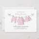 This design features a girl cute pink simple floral pattern shower invitation with a minimalist minimal clothing clothes, with a QR code for social media Facebook event page for rsvp online via website and a whimsical clothesline dress bunting, an elegant script calligraphy, a watercolor baby girl clothing line, a chic creative girly sweet adorable, for mother to be mummy mum, a trendy stylish pink simplistic, a cute girl baby shower invites, for a cute baby girl shower invitations,