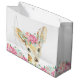 Deer baby shower gift bag with adorable watercolor baby girl deer with flowers on her head on a background of pretty watercolor flowers. This cute girl deer baby gift bag is easily customised with text.