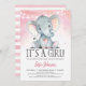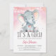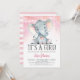 It's a Girl! Cute pink elephant baby shower invitation. Watercolor background and striped back.