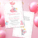 This adorable baby shower invitation features a girl elephant being flown by heart balloons with elegant script and modern text for your details. Back features elephant holding a star balloon and text for a book request, or can be deleted for a clean look. Easy to customise by clicking "Personalise".