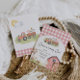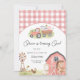 Adorable farm themed birthday invitation featuring farm animals, a barn and pink gingham print.