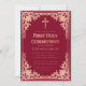 This elegant burgundy and rose gold first communion invitation with a vintage air, recommended for a girl, has an ornate faux rose gold foil frame with elegant baroque pink decorations on a burgundy background. Above the text there is a religious cross in rose gold. Except the occasion "First Holy Communion", that is also in rose gold, all text can be personalised and has a pink colour similar to the rose gold frame.