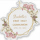 This elegant floral geometric first communion design, recommended for a girl, combines the trends of 2019: geometric and metallic (gold). The geometric, irregular gold frame has flower bouquets of pink and white orchids up and down over two gold hexagons that overlay, with a gold cross on top. The Name is written in an elegant calligraphic script. All text has a golden colour, like the gold frame.