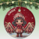 Girl Gingerbread Village House Christmas Decor Ceramic Ornament. The unique female whimsical character's editable name "GINGER" shines bright in the berry red, sparkling star filled sky. Cute girly cartoon graphic illustration with wintry landscape perfect for gifting women friends, family, or stocking stuffing.