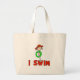 A stick figure girl in a green bathing suit dives into the water with the fish on this cute stick figure I Swim bag that is customisable so you can add a name or text saying!
