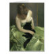 A girl is sitting in a beautiful green dress with a black cat. They both look very relaxed. It is another time and place. They are at peace.