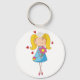This design is a girl in love. The girl is stnding holding a pink flower with love hearts. This girl in love design looks great on this Keychain