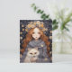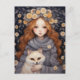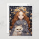 This cute illustration depicts a little girl cuddling a red fox. They are surrounded by flowers reminiscent of folk art, and the child herself has a floral crown, giving this lovely card a magical, fairytale feel.