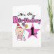 Baby' girl first birthday T-shirts, bodysuits, cards, stickers, magnets, bags, and other first birthday apparel and gifts featuring a baby girl in a pink tshirt, diaper, and party hat with birthday balloons!