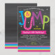 This girl birthday invitation is perfect for a jump party or bounce-house birthday party! Features bright neon colours on a chalkboard background accented with dots and stars. Contact us if you need this design applied to a specific product to create a matching item! Thank you so much for viewing a DoodleLulu by 2 june bugs design!