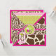 Wild and fun monkey hanging on jungle vine and a wild pacifier with zebra, giraffe, leopard, and cheetah patchwork prints with 3D-look lace trim ribbons baby shower invitation. Colours are hot pinks, greens, and browns.