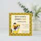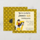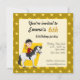 Print invitations for girls' birthday party with illustration of a girl horseback riding a cute white pony with black mane, on seamless golden yellow pattern with stars, farm animal design for kids