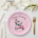 A girl riding a pink scooter carrying lots of presents. "Happy Birthday" text.