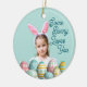 Girl Photo with funny Easter Bunny Ears and painted eggs on blue background on your own Easter ceramic ornament. May be a keepsake for yourself, or a personalized gift for a friend or family member. Generative content images may be changed. Humor Greeting saying "Some Bunny Loves You" on the front of the ornament, and on the back, the greeting text. If you replace the girl photo with your own, please use the option "remove background" from edit menu.