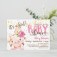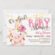 Baby girl pig, piggy farm animal baby shower invitation. Colours include brown, tan, and pink.