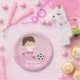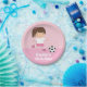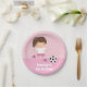 Birthday party supplies paper plates to match the soccer themed birthday party! It features a cute girl with her hair tied in a pony tail. She is dressed in a white soccer jersey with pink stripes, pink shorts and matching soccer boots. A football is by her feet. Personalise with your party message.