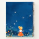 A young girl ponders the future in a field surrounded by wildflowers and white birds in flight. A truly stunning scene. The girl wears a straw hat, white shirt, and orange skirt with white polka dots. A lovely gift for anyone finds peace and joy in journalling.