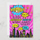 Super hero comic book theme with city scape background, starburst and fighting word action bubble birthday party invitation card design for girl.
