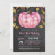 Pumpkin First Birthday Invitation. Pink, Black and White. Watercolor Pumpkin Leaves. Girl Bday Party Invite. Chalkboard Background. 1st 2nd 3rd 4th 5th 6th 7th 8th 9th 10th, Any Ages. For further customisation, please click the "Customise it" button and use our design tool to modify this template.