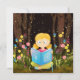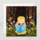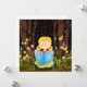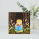 Digital illustration depicts a pretty young girl with blonde hair wearing glasses and a pink pullover. She is sitting in a meadow among bright flowers and herbs, holding a science book. She is surrounded by picturesque trees and beautiful nature