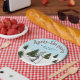 Celebrate a birthday on the slopes with these ski-themed paper plates, designed by Destei. The design features a watercolor illustration of a girl skiing down snowy slopes, wearing a teal jacket with a brown hat and gloves, surrounded by green fir trees under a light blue winter sky with falling snow. The plates can be personalized with text, making them a festive and fun addition to a winter birthday party.