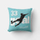 Female soccer player silhouette throw pillow with black and white graphic of silhouette of girl kicking a soccer ball for goal superimposed over the word "goal" - choose ANY background colour (shown here in aqua) and customise her name and jersey number - by katz_d_zynes