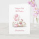 Make her first birthday even more memorable with this delightful teddy bear card. The lovable bear, decorated with cute pink bows, holds a bunch of pink and white balloons while sitting next to a pastel pink birthday cake crowned with one shining candle.