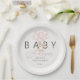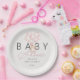 Cute girl teddy bear holding balloons baby shower paper plates.