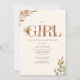 Boho baby shower theme with "GIRL" lettering in terracotta colour decorated with boho pampas and other botanical and floral designs. Botanical designs at corners.