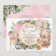 Celebrate the upcoming arrival of your little one with this whimsical woodland themed baby shower invitation. The design features a group of adorable tribal forest animals (deer, bear, raccoon, fox & owl), pretty pink flowers and lush watercolor greenery.