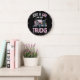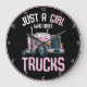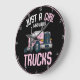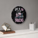 This charming wall clock is designed for the girl with a passion for big rigs. It features a cute pink semi-truck illustration set against a black background, framed by a vibrant pink rim. The playful text "JUST A GIRL WHO LOVES TRUCKS" is prominently displayed in white and pink fonts, making it an ideal gift or decorative item for any female truck enthusiast, highlighting a unique and spirited interest.