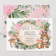 She's turning a WILD ONE! Celebrate your little one's 1st birthday with this whimsical woodland themed birthday invitation. The design features a group of adorable forest animals (bear, fox, deer, owl, raccoon), pretty pink flowers and lush watercolor greenery.