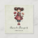 Business cards with a cute retro image featuring a whimsical girl with rosy cheeks and flowers in her hair. Carrying a green frog doll.