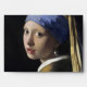 Girl with a Pearl Earring by Johannes Vermeer, 1665, is an oil on canvas painting of a young girl in three-quarter profile view gently turning her head and looking warmly at the viewer. The headpiece scarf wrapping and hanging from the subject's head is rendered in sunny, contrasting tones of warm yellows and cool blues, here an ultramarine tint or cornflower blue, a colour scheme explored in many of the Dutch master's compositions. Her pearl earring glistens softly in white highlight at the centre of the composition. The girl's enigmatic expression is timelessly frozen in anticipation of a smile, laughter, or asking a question of the viewer.