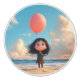 A heartwarming 3D illustration of a cute cartoon girl holding a red balloon while standing on a beach at sunset. With her windswept black hair and wide-eyed smile, she radiates innocence and joy. The dreamy clouds and gentle ocean waves in the background create a magical, peaceful atmosphere. Perfect for children’s rooms, nursery decor, greeting cards, or uplifting wall art for dreamers of all ages.