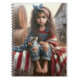 Cute little girl sitting on a hay bale with an American flag and kitten
