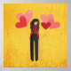 Cute graphic of a girl holding a bunch of heart shaped balloons. Cute and whimsical and girly against a stylish textured golden backgound.