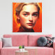 A girl with blue eyes on an orange background, dark black and crimson, photorealistic fantasies, personal iconography, detailed character design, shiny/glossy