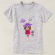 T-Shirt with a girl, her cat & flying saucers. Eli, the girl, is wearing a magenta dress and a hat and her grey cat is also wearing a hat. Enjoy this T-Shirt with a